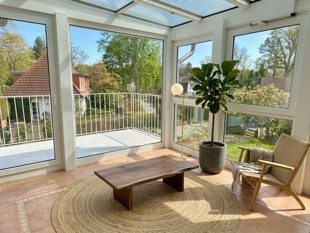 Der gepflegte Garten lädt in den Sommermonaten zum Aufenthalt im Freien ein, während der verglaste Wintergarten im Obergeschoss auch in der kühleren Jahreszeit einen hellen und geschützten Rückzugsort bietet.