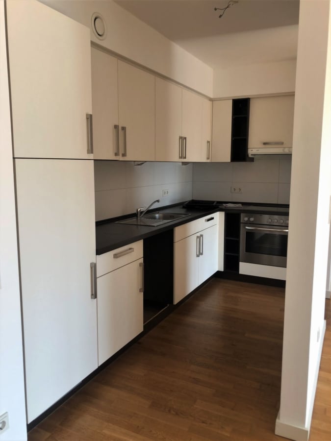 Die Wohnung überzeugt durch einen lichtdurchfluteten Wohnbereich und eine moderne Ausstattung. Bei dem Wohnbereich handelt es sich um ein großzügiges Wohnzimmer mit einer offenen Einbauküchenzeile. Die Einbauküche ist ausgestattet mit Cerankochfeld, Backofen und Edelstahlspüle. Des weiteren verfügt die Wohnung über ein Duschbad mit bodengleicher Dusche.