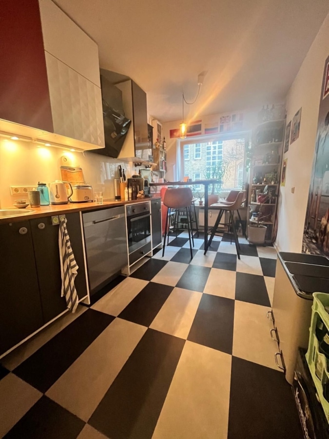 Die 3-Zimmer-Wohnung befindet sich im 2. Obergeschoss eines Mehrfamilienhauses. Zwei der drei Zimmer liegen nach hinten zum Innenhof mit sonnigem Balkon. Die Einbauküche gehört den aktuellen Mietern. Außerdem bietet die Küche Platz für eine Sitzgelegenheit. Des Weiteren verfügt die Wohnung über ein hell gefliestes Vollbad.