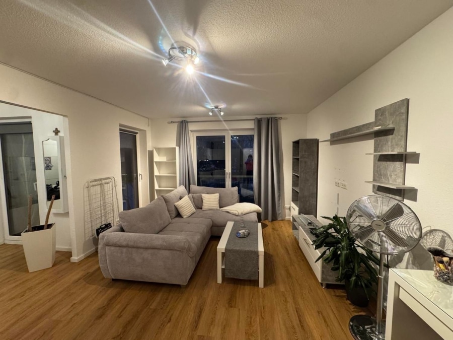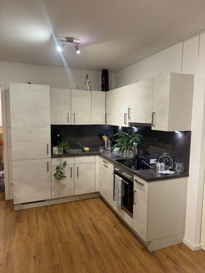 Bei dem Wohnbereich handelt es sich um ein großzügiges Wohnzimmer mit einer offenen Einbauküchenzeile. Die Einbauküche ist ausgestattet mit Cerankochfeld, Backofen, einer Spülmaschine und einem Kühlschrank mit Kühl-/Gefrierkombination.